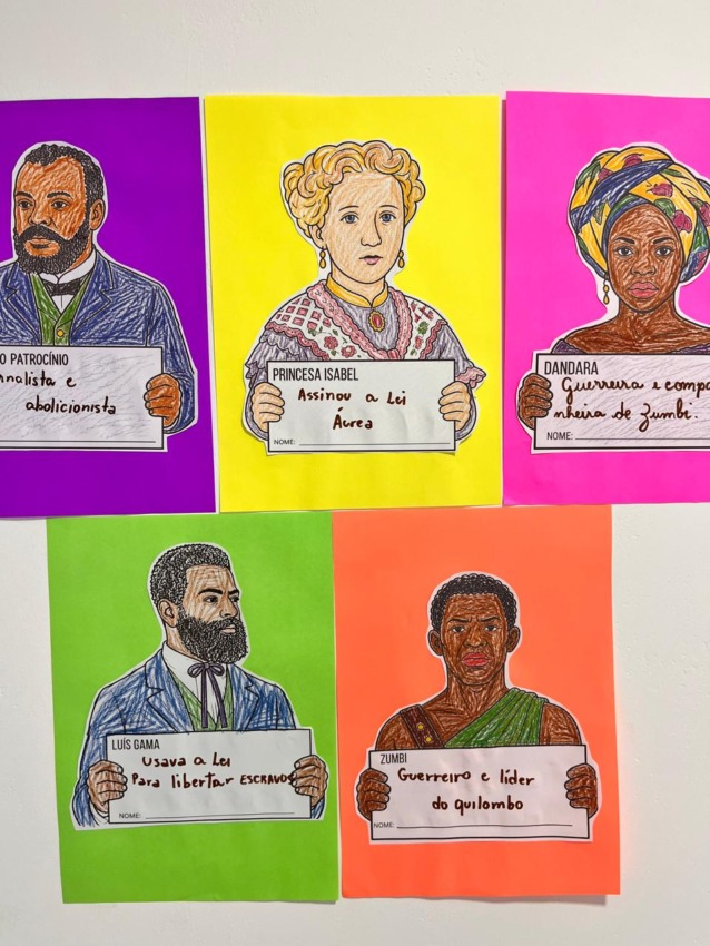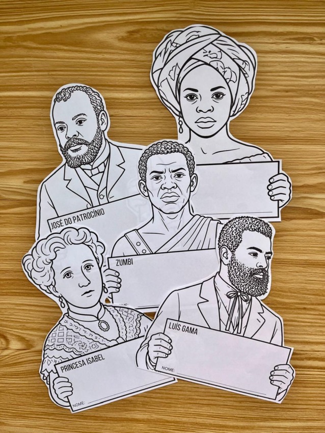 Personagens como Zumbi, Dandara, Luís Gama e José do Patrocínio, em versão para colorir e trabalhar em sala