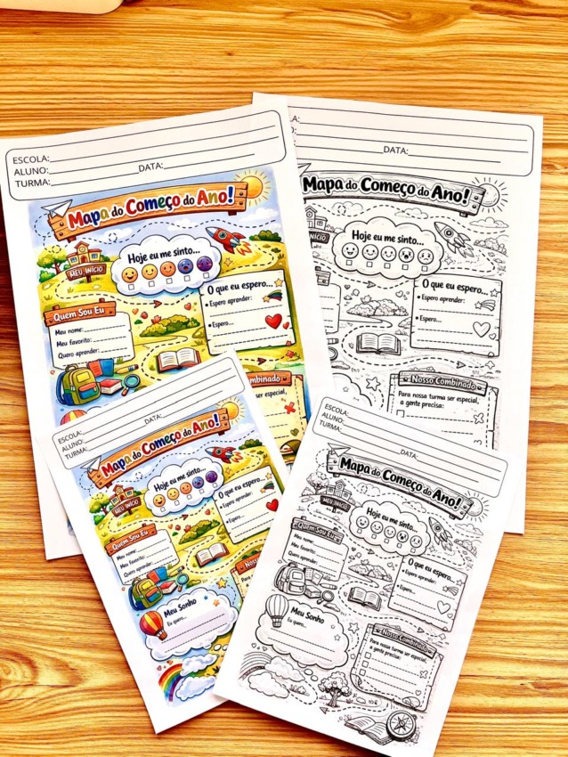 Pensando nisso, eu criei o Mapa de Começo do Ano: um recurso simples, intencional e cheio de significado, que ajuda os alunos a expressarem seus sentimentos, expectativas e sonhos, enquanto você conhece melhor sua turma e cria um clima acolhedor desde o primeiro contato.