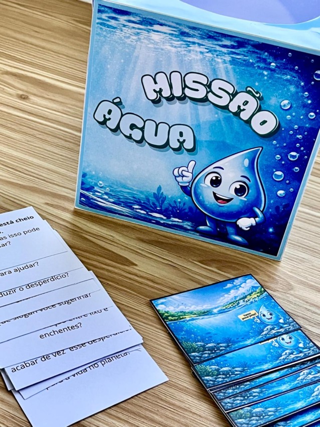 Por meio de um jogo de cartas com desafios e situações-problema, os alunos são convidados a discutir temas como uso consciente da água, impactos da poluição, preservação dos recursos naturais e responsabilidade ambiental.