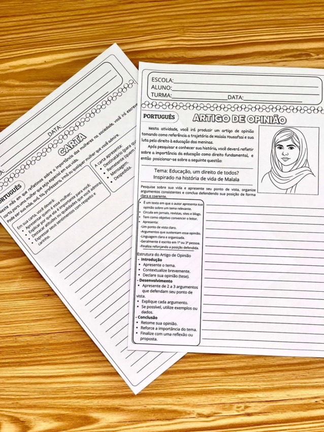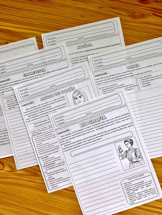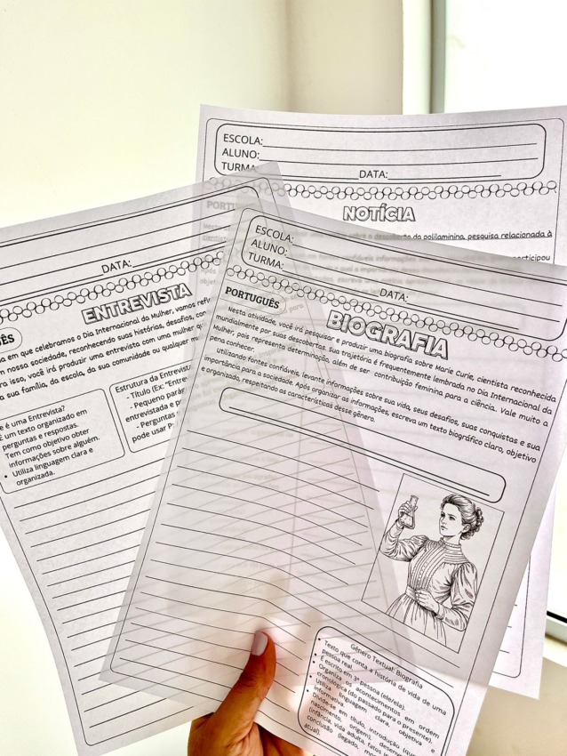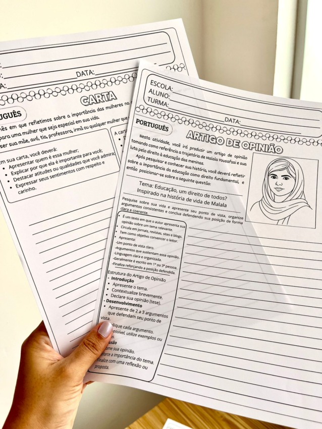 Tudo contextualizado com mulheres inspiradoras e temas relevantes, desenvolvendo repertório, argumentação e consciência social.